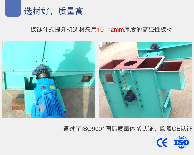 設(shè)備質(zhì)量的好壞直接影響其工作效率,板鏈斗式提升機(jī)選材采用10-12mm厚度的高強(qiáng)性板材,產(chǎn)品不合格不出廠,我們生產(chǎn)的板鏈斗式提升機(jī)通過了ISO9001國際質(zhì)量體系認(rèn)證,歐盟CE認(rèn)證,廠家承諾如果我們的產(chǎn)品在售出后30天出現(xiàn)問題可以免費(fèi)退換。