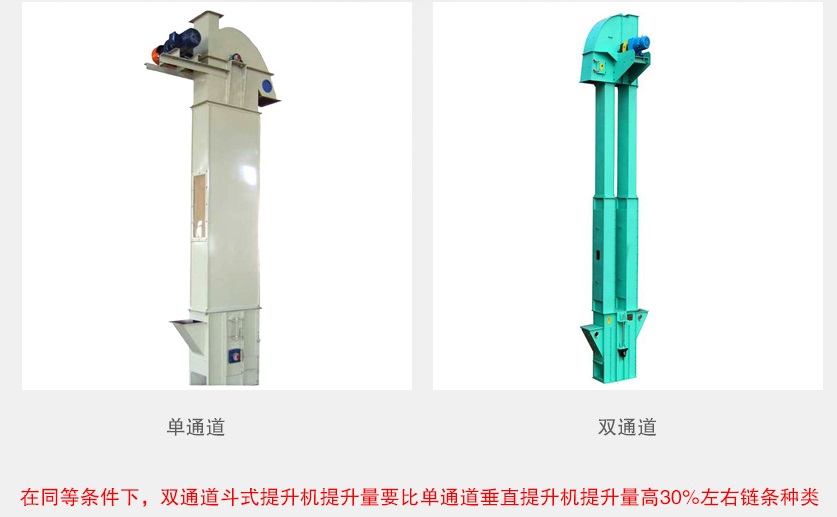 環(huán)鏈斗式提升機分為單通道和雙通道兩種,雙通道主要是加強整機的中間節(jié)強度,提升量會高出30%左右,一般的單通道斗式提升機是料斗的上行和下行都是在一個機殼通道內(nèi),價格會比雙通道斗式提升機更便宜。